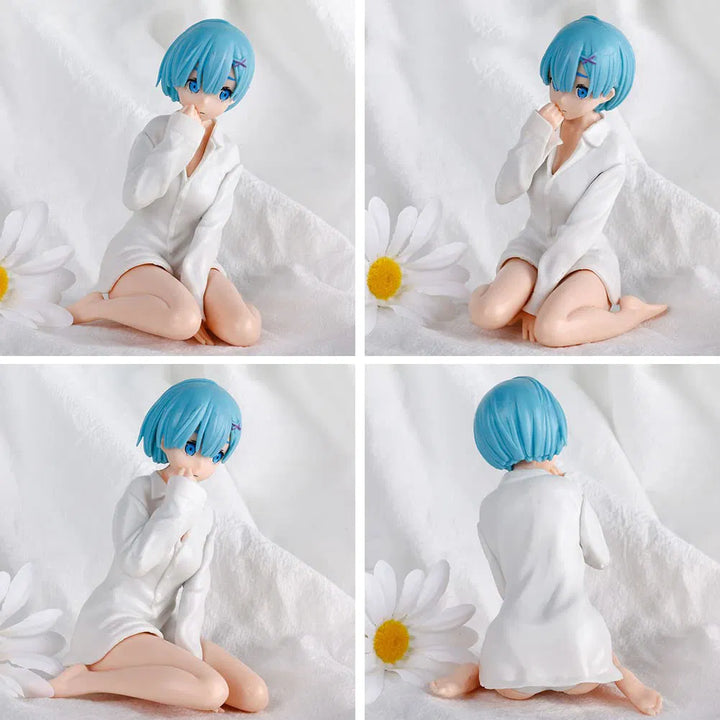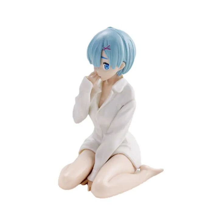 11 cm PVC REM Action Figure Model Toy with Blue Hair Sitting on Knees, Wearing White Shirt