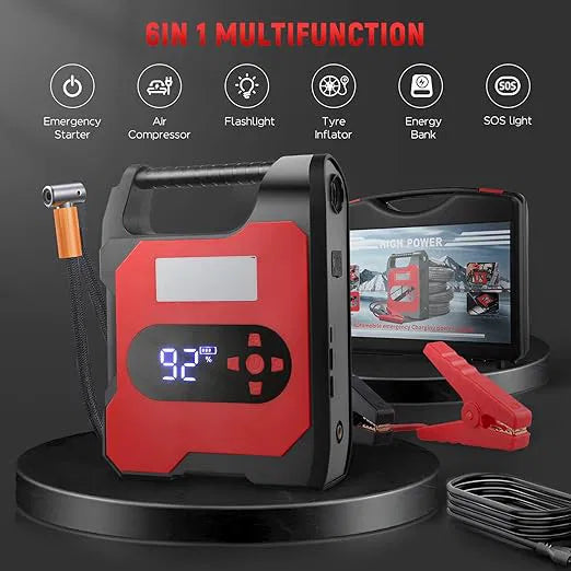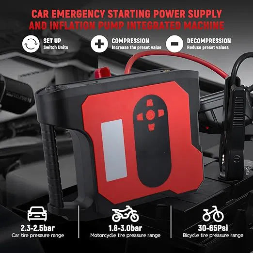 Jump Starter Power Pack with tyre inflator, powerful & extensive compatibility.