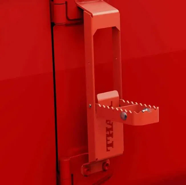 Door Hinge Step compatible for Thar (Set of 2, Red). Door hinge step like a mini ladder, help you to put or take things from car roof. It can fold after you using it. It has a anti-skid strip hollow design keeps your feet from slipping off pegs, especially in muddy and wet conditions.